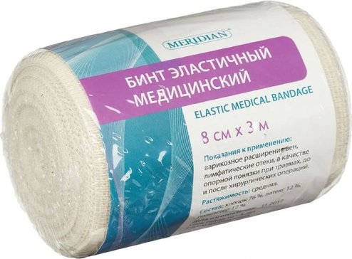 Бинт медицинский эластичный “Меридиан” Произведен из натурального сырья, гипоаллергенный, края аккуратно обработаны, имеет две удобные клипсы для фиксации, товар запаян в термоусадочную пленку